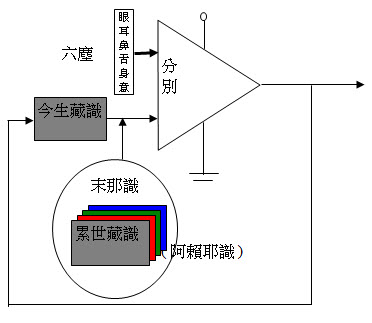 我們的心(第六識)將由感觀進來的資訊與(今生藏識裡的以往經驗 + 种子異熟, 末那識裡的累世藏識) 做比對, 而產生愛恨等情感